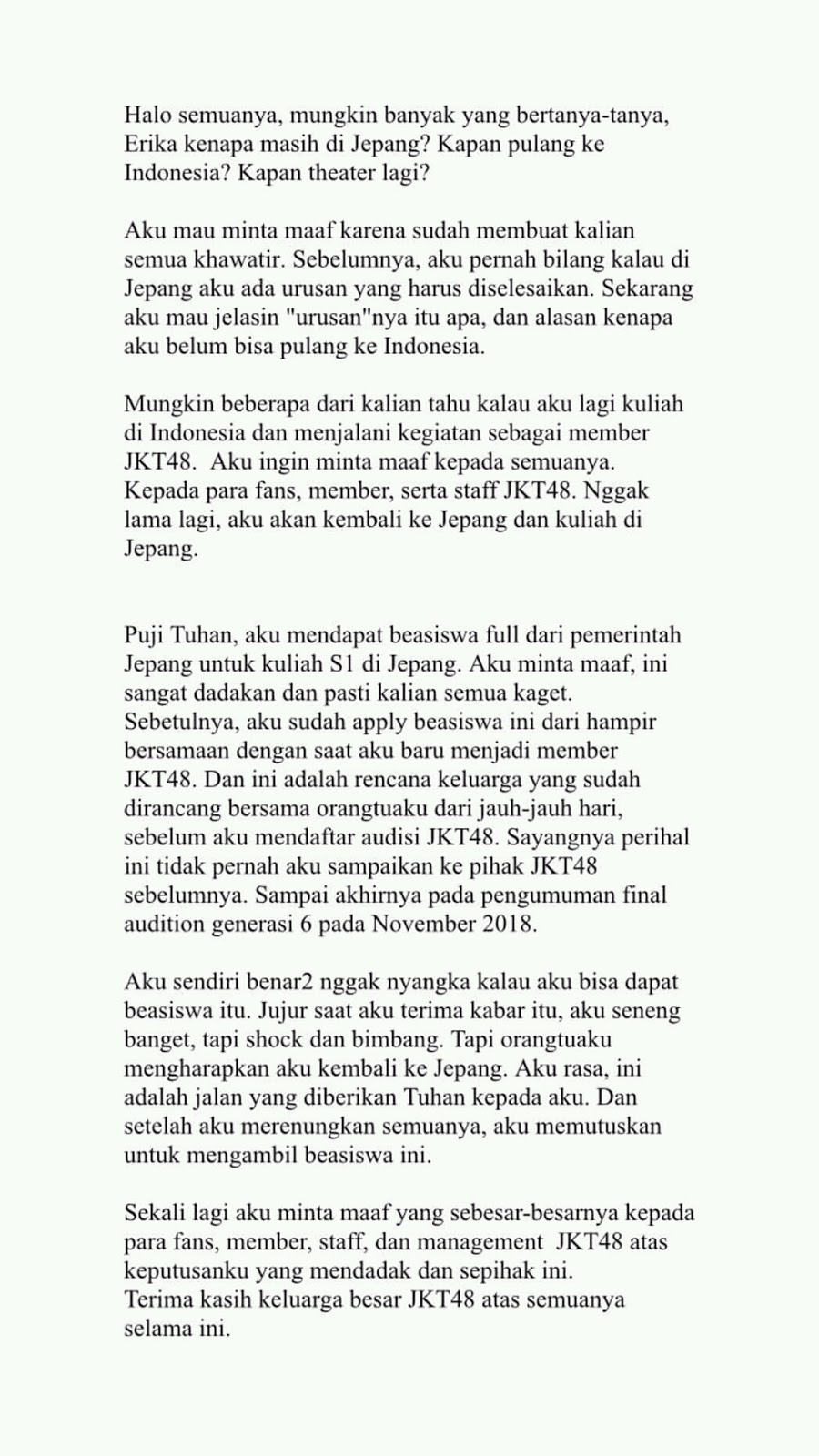 “Selamat siang semuanya. Kepada para fans, teman-teman member, dan staff JKT48 yang udah dukung aku sampai sekarang. Aku minta maaf atas atas kesalahanku selama ini. Aku bahagia bertemu kalian. Mohon dukungannya untuk aku meraih impian berikutnya. Terima kasih atas segalanya 🙏,” tulis Erika. Ia juga mengunggah gambar berisi uraian penjelasan mengenai keputusannya ini.